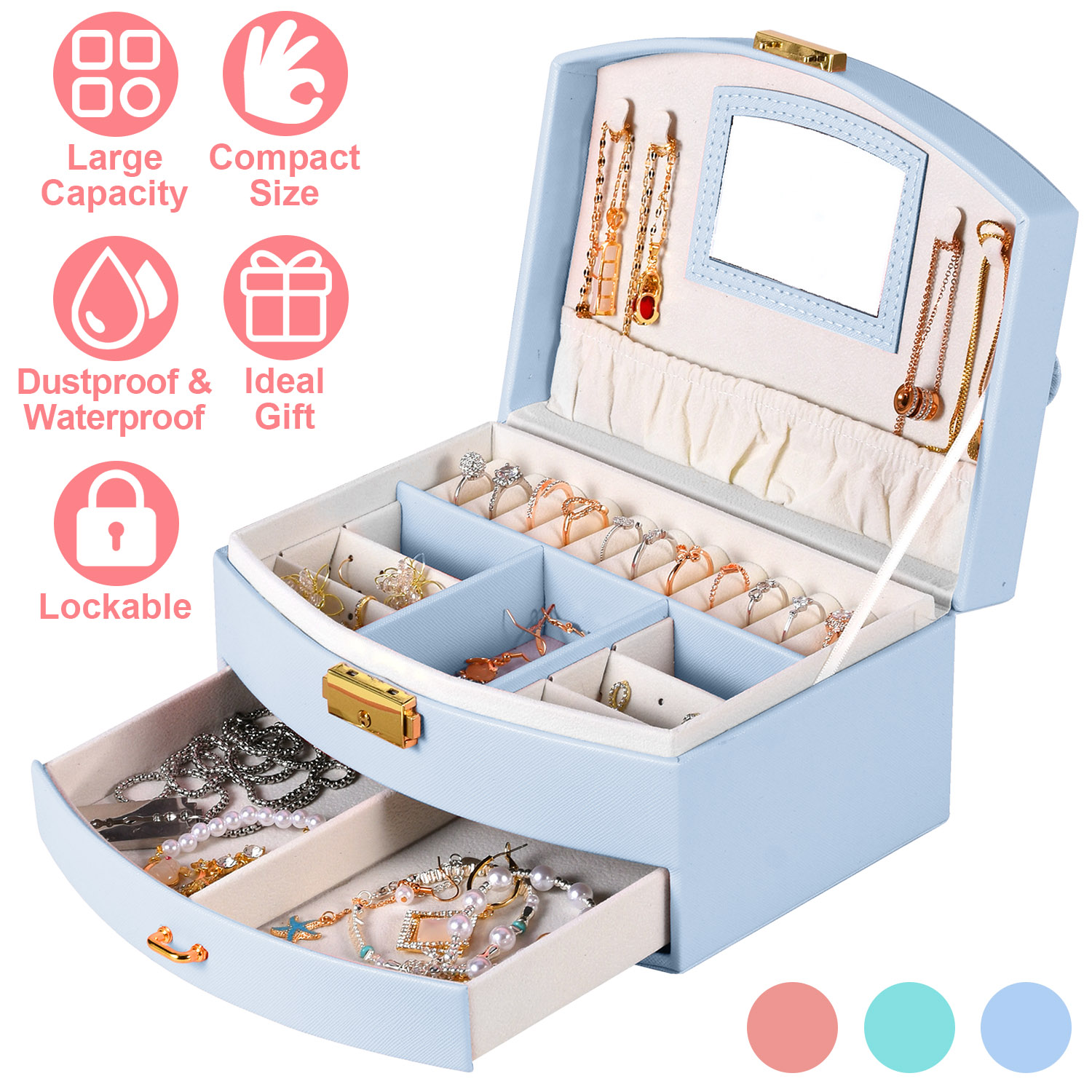 Home > 2-Layer Jewelry Box for Women Girls Lockable Leather Jewelry Organizer Jewelry Travel Case for Rings Earrings Necklaces Bracelets