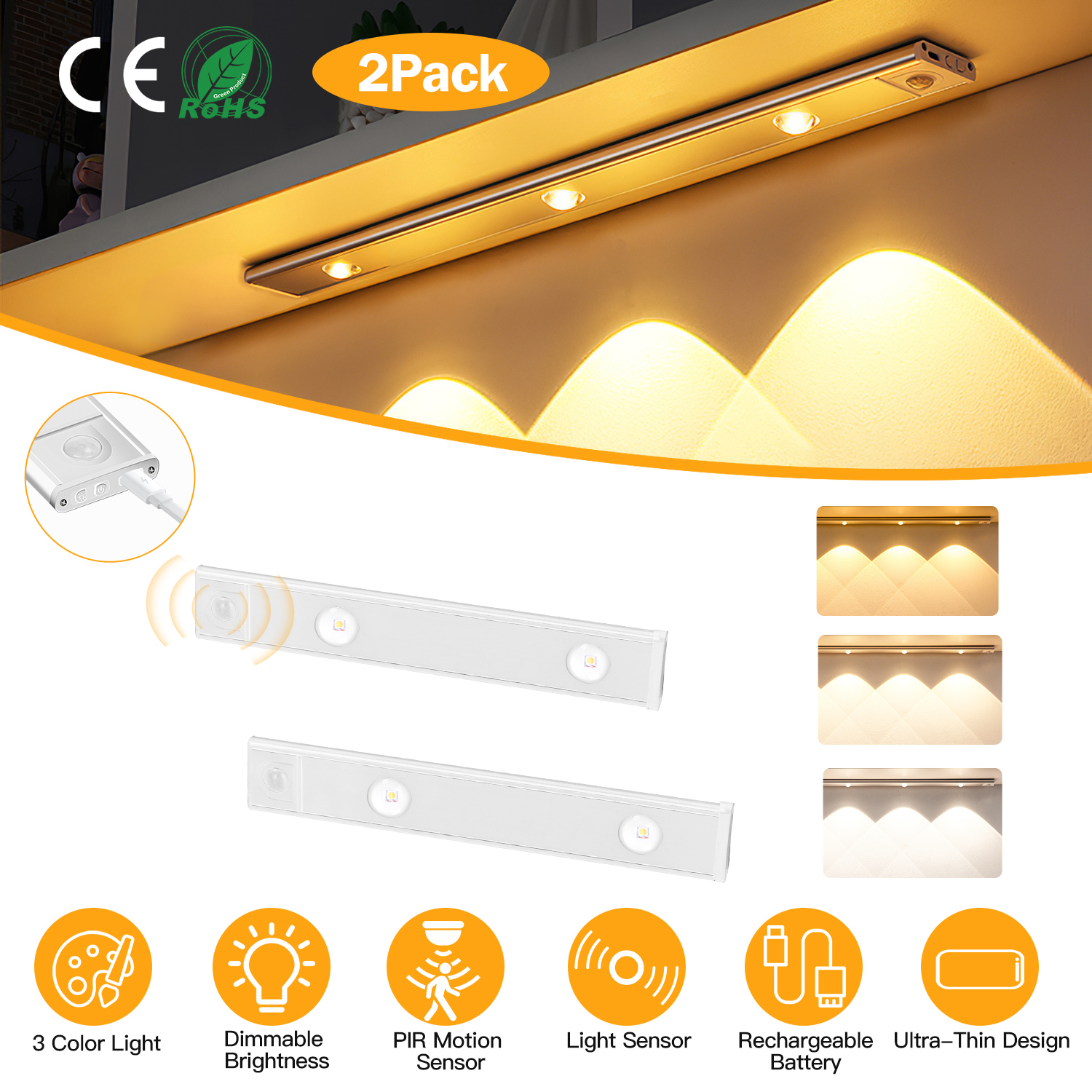 2Pack Rechargeable Cabinet Light Motion Sensor Light Cordless LED Closet Lamp 3 Colors Dimmable Light for Kitchen Cabinet