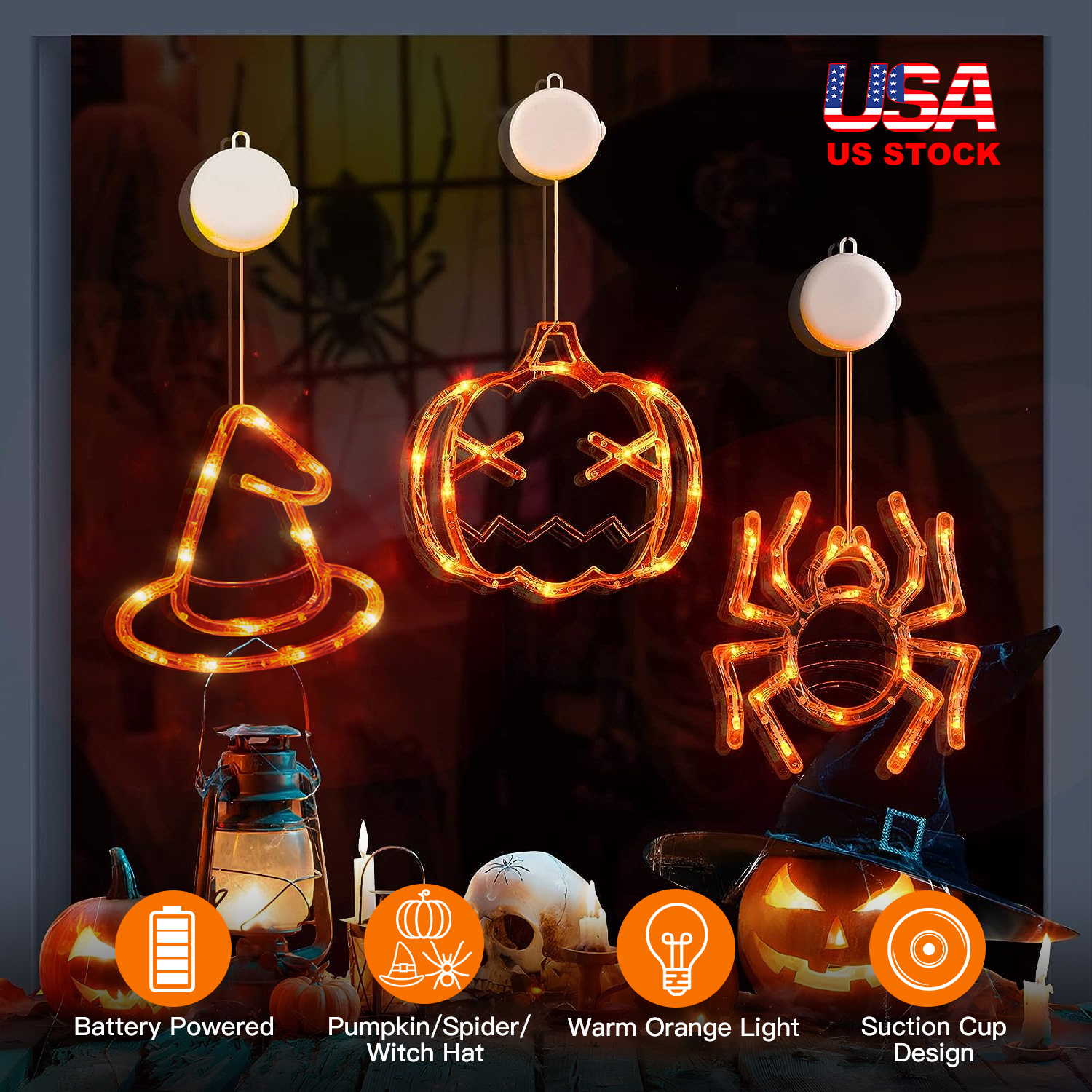 Home > 3 Pack Halloween Window Light Spider Witch Hat Pumpkin with Orange Light Hanging Halloween Decoration Light with Suction Cup Hanging Holes