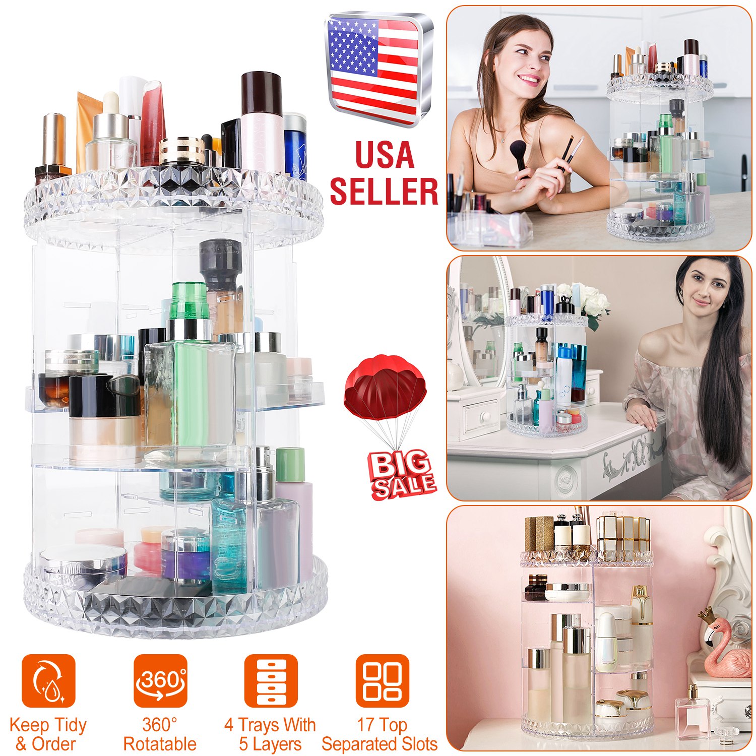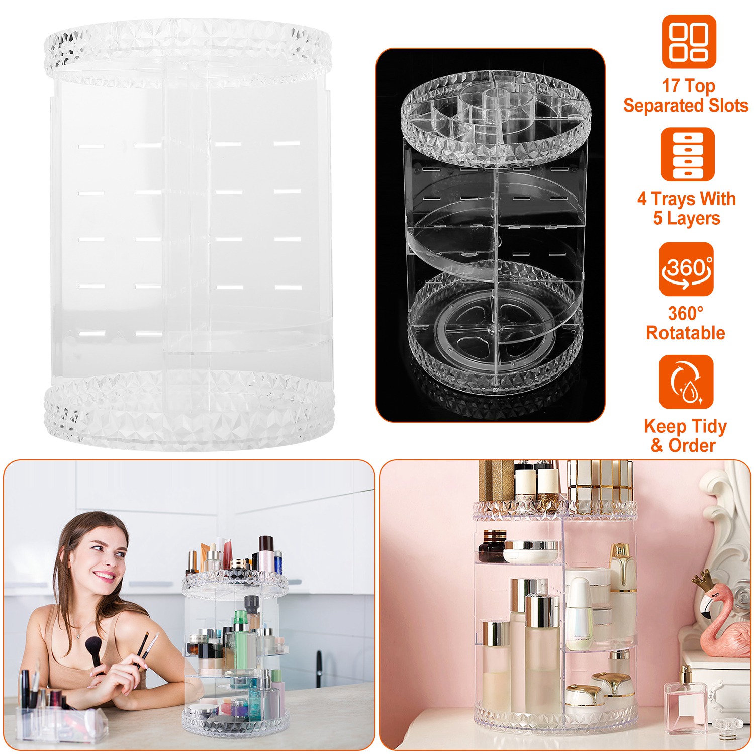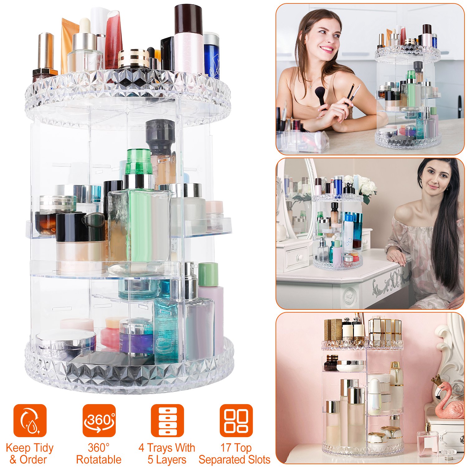 Home > 360° Rotating Makeup Organizer Clear Cosmetic Storage Rack Transparent Jewelry Display Box Case with 4 Trays One 17-Slot Top Shelf
