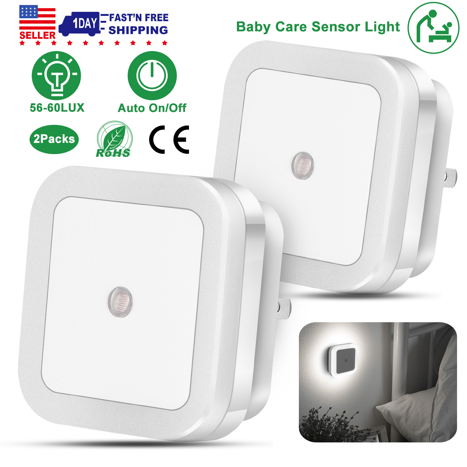2Packs LED Night Lights Plug-in Light Sensor Lamps Cordless Indoor LED Lighting For Postpartum Mother Babysitter Aged Parent Bedroom Bathroom