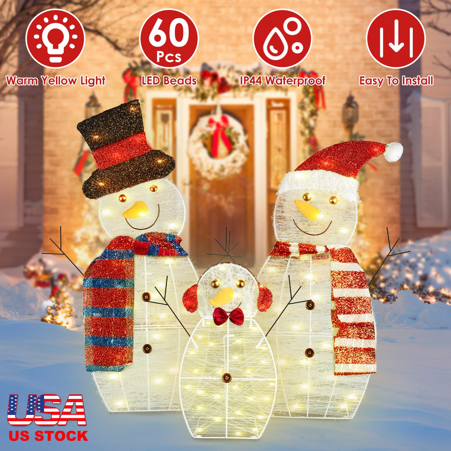 3Pcs 2D Christmas Snowman Yard Decoration Snowman Family Outdoor Decoration With 60Pcs LED Warm Yellow Lights IP44 Waterproof For Christmas Indoor Out